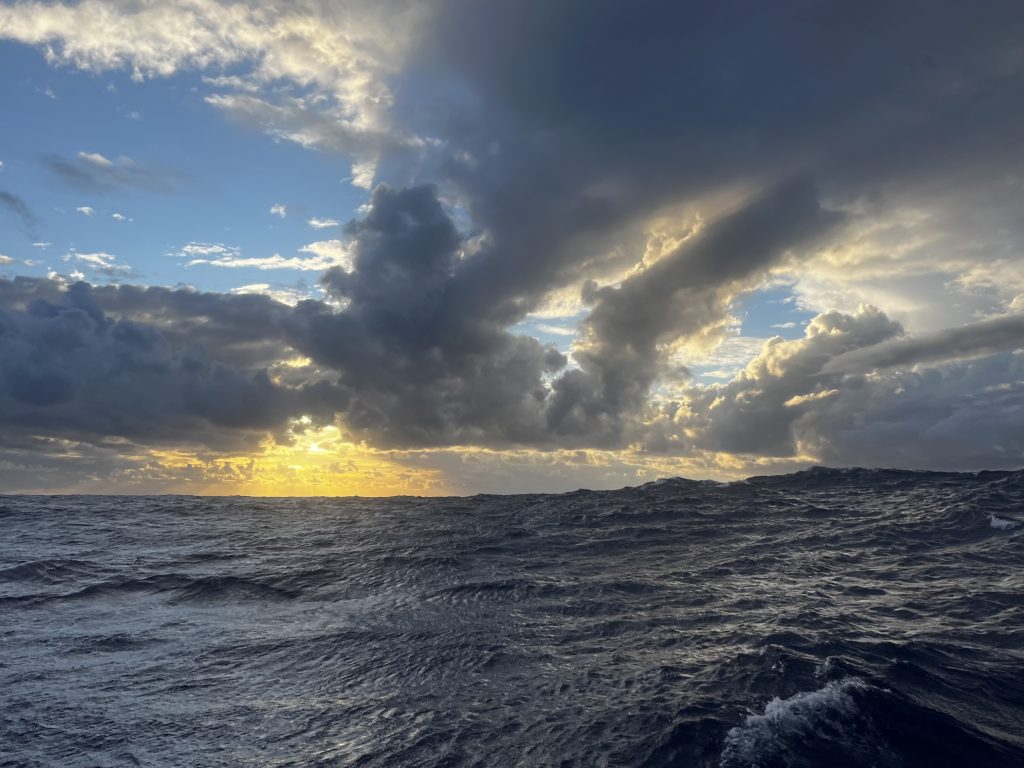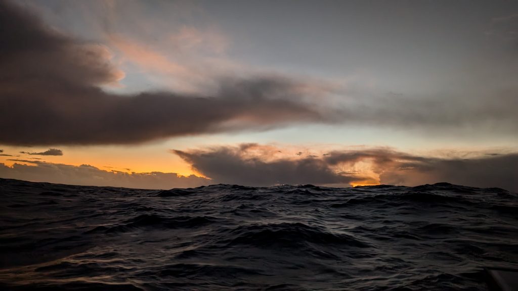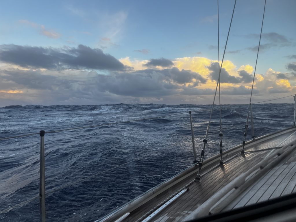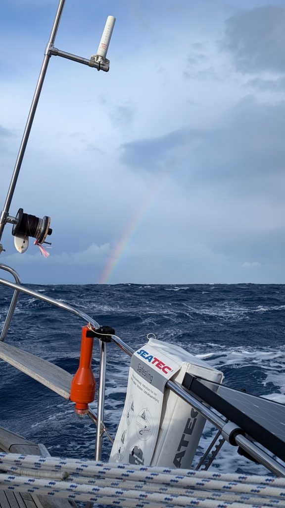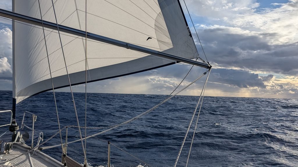 Als endlich wieder der Tag anbrach, funkelte uns nicht nur die Sonne entgegen, sondern wir bekamen auch wieder einen großartigen Segelwind. Mit dem 2. Reff im Großsegel und ausgebaumter Genua flogen wir durch die Wellen und genossen das Rauschen, wenn wir von den Wellenkämmen heruntersurften. Die Wellen waren immer noch steil, aber längst nicht mehr so chaotisch wie noch in den Tagen zuvor.