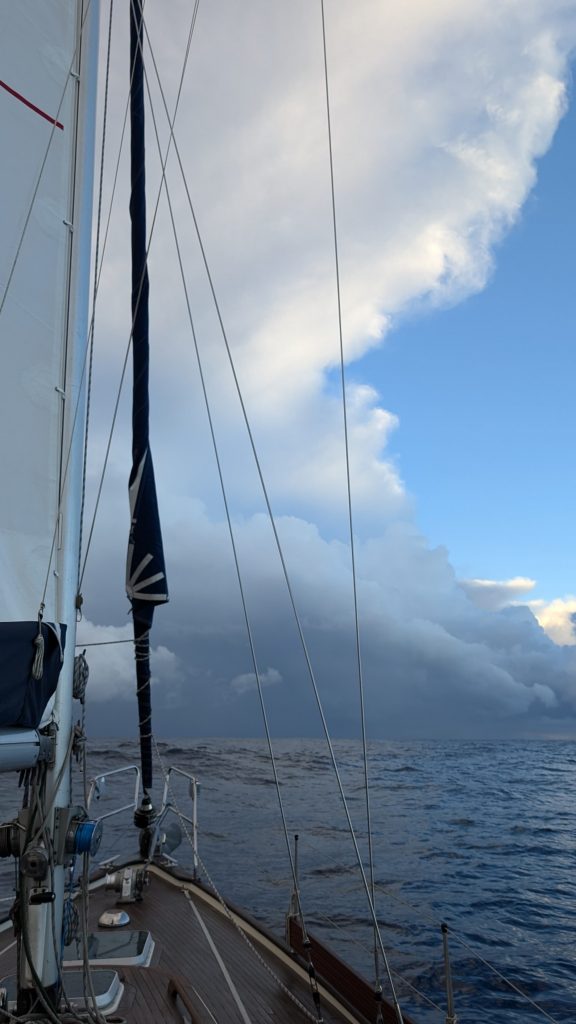 Am späten Nachmittag briste der Wind allerdings wieder auf und diesmal nicht zu knapp. Da die Wolken um uns herum schon merkwürdig zerklüftet ausgesehen hatten – ein Anzeichen für Starkwind – hatten wir zum Glück in weiser Voraussicht noch schnell das Großsegel geborgen. Die Genua hatten wir auf ca. ein Viertel ihrer Größe eingerollt und schon ging es los. Unser Windmesser zeigte Böen mit bis zu 34 Knoten an und trotz der winzigen Segelfläche rasten wir regelrecht die Wellen herunter. Das alles fühlte sich zum Glück sehr kontrolliert an, wir können aber gut und gern auf solche Böen verzichten.