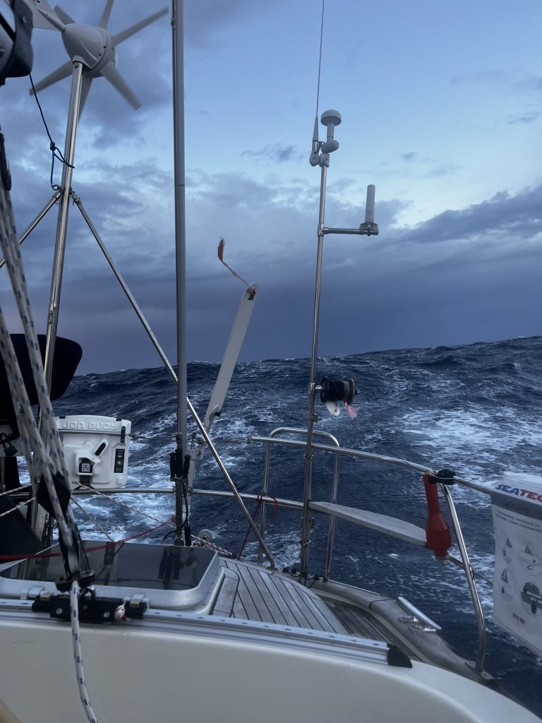 Die Wellen, die sich hinter uns aufbauten sahen beeindruckend aus. Wie eine Wand aus Wasser erhob sich eine Welle nach der nächsten hinter uns, hob die Krassy in die Höhe und ließ sie dann wieder herunterrauschen. Das tiefblaue Wasser wurde dabei von weißem Schaum marmoriert und die bedrohlichen Wolkenberge taten ihr übriges um die Stimmung noch ein wenig schauriger zu machen. Aber wie gesagt, wir fühlten uns auf unserer Krassy sehr sicher. Wir haben viel Vertrauen in unsere schwedische Lady und bisher hat sie uns immer wieder gezeigt, dass dieses Vertrauen durchaus berechtigt ist. Das hier und da mal ein Schäkel bricht ist ganz normal, das passiert auf allen Booten und ist den meisten Fällen hauptsächlich nervig, aber nicht zu schlimm.