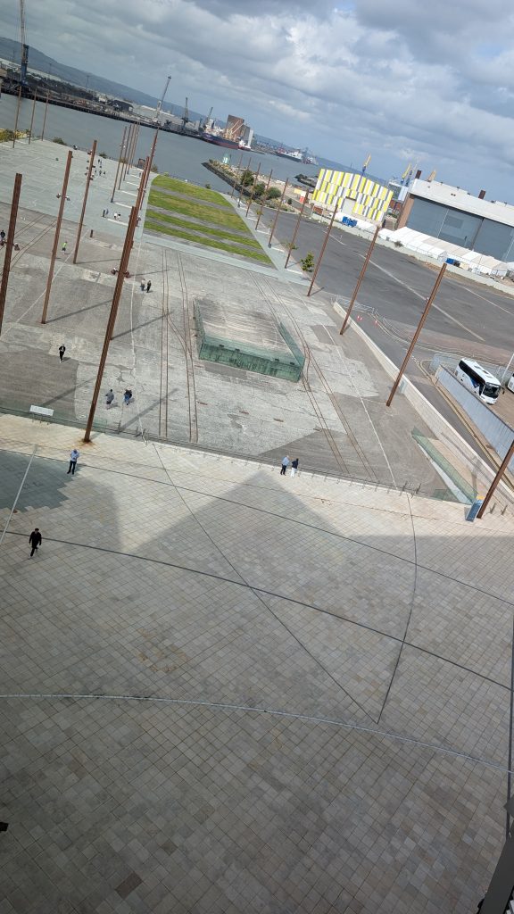 Da sich das Museum auf dem ehemaligen Gelände der Werft befindet, kann man hier sogar in den Genuss kommen auf eben jener Fläche zu flanieren, wo damals in zwei parallel angelegten Docks die Titanic und Olympic zeitgleich gefertigt wurden. Die Docks sind heute zugeschüttet und auf der parkähnlich angelegten Fläche sind die Umrisse der beiden Ozeanriesen mit Leuchtstreifen im Boden eingelassen. Wo damals die Titanic stand, sind auch die Umrisse einiger Einzelheiten, wie der markanten Abluft-Türme zu erkennen. Die Fläche der Olympic dient als Gedenkstätte und markiert die Anteile der verstorbenen und überlebenden Passagiere der verschiedenen Klassen, sowie der Crew mit abwechselnden Holz- und Rasenflächen. Es ist schon beeindruckend, hier herumzuspazieren, auch wenn die beiden Schiffe aus heutiger Sicht und im Vergleich zu den meisten modernen Kreuzfahrtschiffen eher mickrig daher kommen. Ähnlich imposant war es übrigens auch die ehemaligen Docks vom Wasser aus zu sehen, als wir Belfast am folgenden Tag wieder verließen. Kaum vorstellbar, wie überwältigend es ausgesehen haben musste, dieses ikonische Schiff hier ins Wasser gleiten zu sehen…