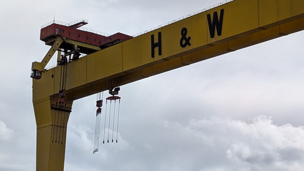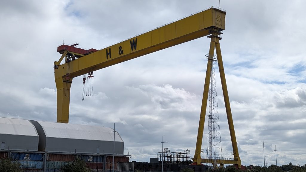 Das Werftgelände von Harland & Wolff, der Werft, die seinerzeit die Titanic und ihre Schwesterschiffe Olympic und Britannic baute, ist im Hintergrund noch immer in Nutzung und stellt mit seinen beiden quietschgelben Baukränen namens Sampson und Goliath ein weiteres Wahrzeichen der Stadt zur Verfügung. Die beiden Werftkräne waren zwar nicht am Bau der ikonischen Schiffe Anfang des Jahrhunderts beteiligt, dominieren aber sowohl das Stadtbild, als auch sämtliche Souveniershops.