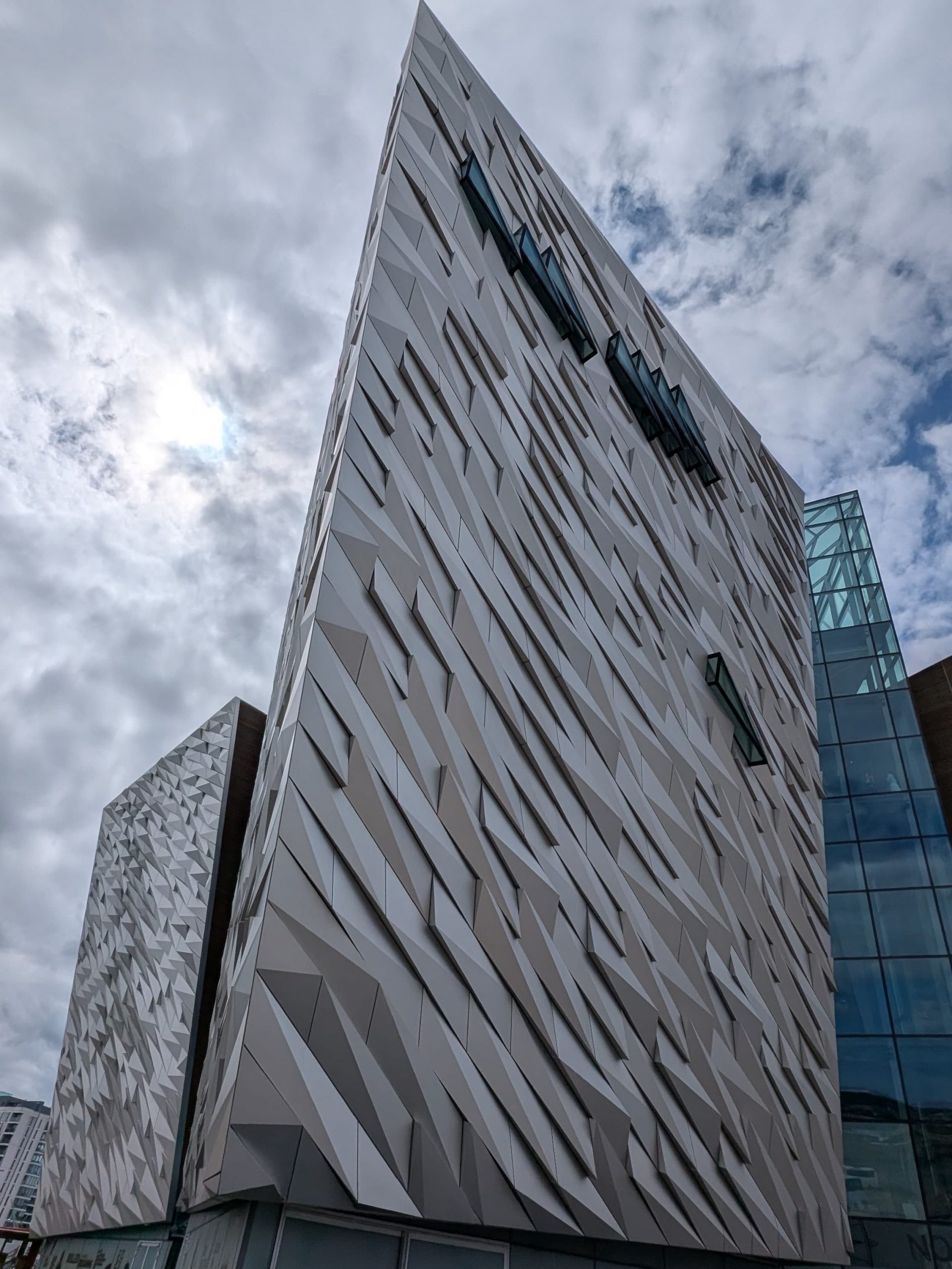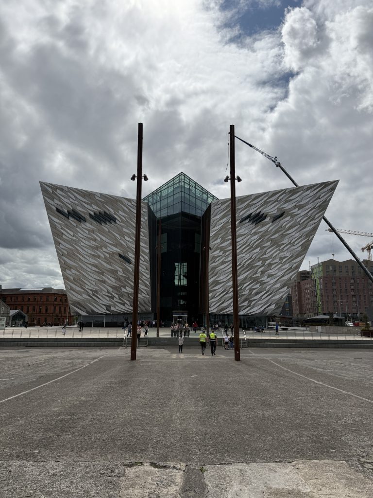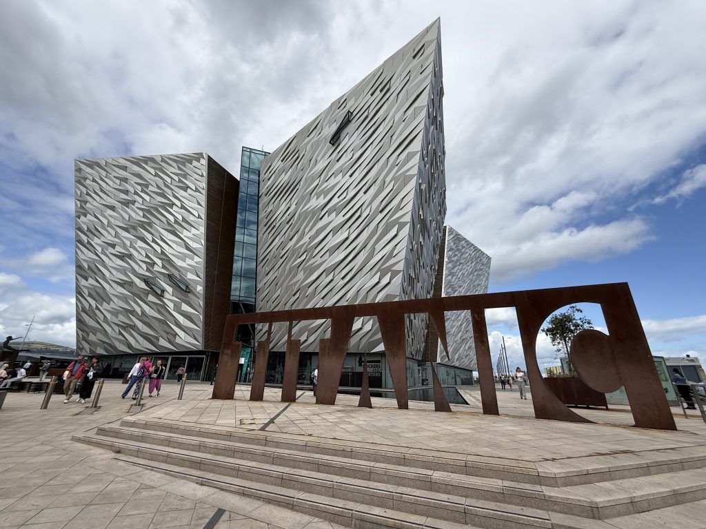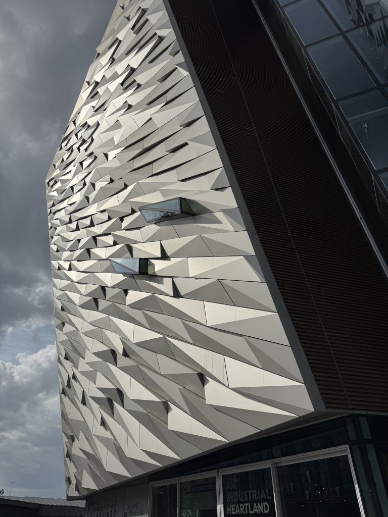 Zunächst mal muss man wissen, dass Nordirland und ganz besonders Belfast, ganz große Nummern im Schiffbau sind und das schon seit vielen Jahren. Die Stadt wird durch den River Lagan geteilt, allerdings befand sich früher auf der Südseite des Flusses kein eigentlicher Teil der Stadt, denn hier war alles ein riesiges Werftgelände. Heute ist das anders, denn Schiffbau gibt es zwar immer noch, aber nicht mehr in ganz so großem Maßstab. Dafür wurde der größte Teil des sogenannten Queen‘s Island zu einem regelrechten Titanic-Themenpark umgebaut und wird heute sogar offiziell als Titanic-Quarter bezeichnet. Das Herzstück ist hier das große Museum in einem futuristischen Bauwerk mit einer Grundfläche von 12.000 Quadratmetern.