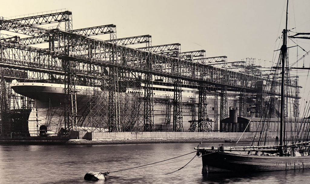 Für den Bau der beiden Schiffe wurden in Spitzenzeiten bis zu 15.000 Arbeiter durch die Werft beschäftigt, von denen schließlich viele durch den enormen Lärm beim Vernieten des Rumpfes als Gehörlose endeten. Ein großer Teil der 3 Millionen Nieten, mit denen die einzelnen Stahlplatten, die den Rumpf bildeten, miteinander verbunden wurden, mussten per Hand eingeschlagen werden. In kleinen Gruppen zogen die Arbeiter also los, wobei einer die Niete erhitzte und festhielt, während zwei andere von der anderen Seite der Platte die glühende Niete mit Hämmern abwechselnd durch die Löcher in den Stahlplatten trieben. Eine unfassbar anstrengende und eben auch unfassbar laute Arbeit.