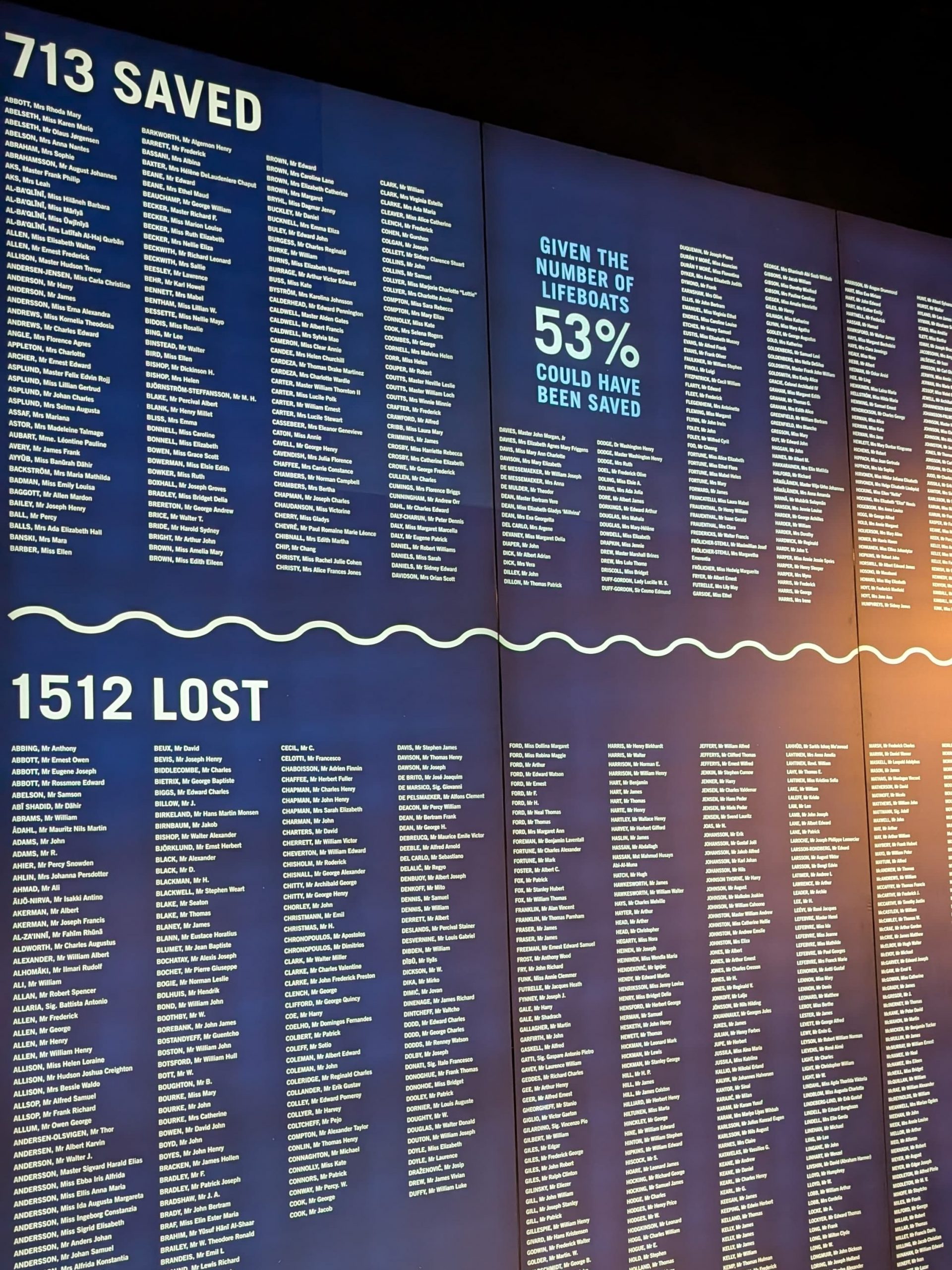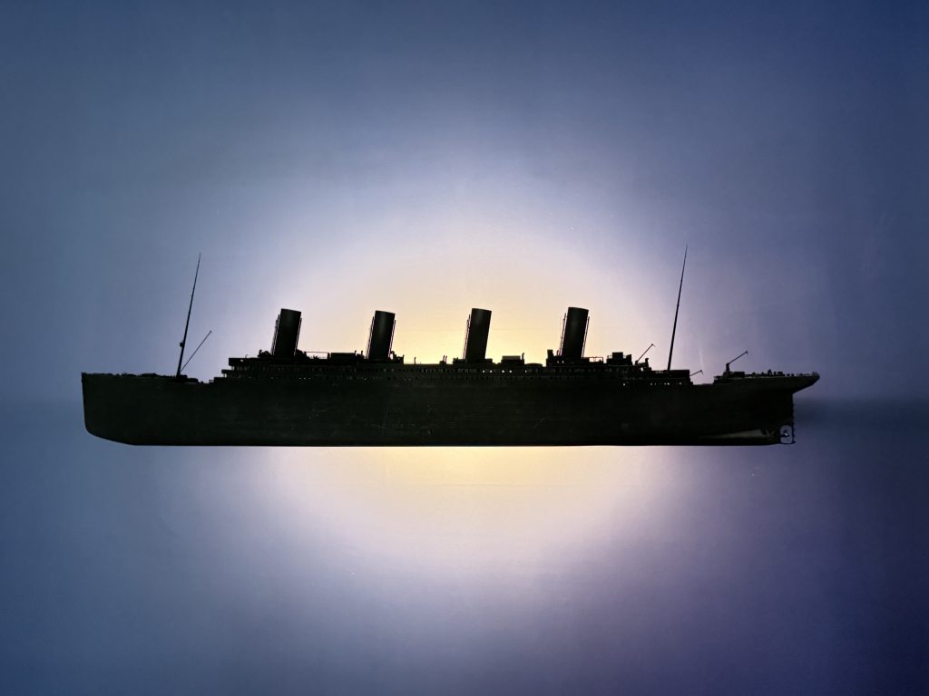 Was auf dem Atlantik passierte weiß heute wahrscheinlich jedes Kind. Am 14. April 1912 um 23.40 Uhr rammte die Titanic mit Höchstgeschwindigkeit die unter Wasser liegenden Ausläufer eines Eisbergs. Der Rumpf des Schiffes riss auf einer Länge von ca. 90 Metern an mehreren Stellen auf, sodass die angeblich „unsinkbare“ Titanic gegen 02:20 Uhr morgens in den unbarmherzigen Tiefen des Ozeans verschwand. Von den 2225 Menschen an Bord des Schiffes starben in dieser Nacht 1512 und nur 713 wurden gerettet. Der Untergang der Titanic gilt als eine der größten, menschengemachten Katastrophen der jüngeren Geschichte. Besonders tragisch ist dieses Unglück nicht nur, weil die Reederei die Titanic als „unsinkbar“ betitelt hatte, sondern auch, weil hier so viele Fehler gemacht wurden. In der Ausstellung wird dem Untergang des Schiffes selbstverständlich ein großer Anteil zugedacht, daher findet man hier auch ein paar interessante Informationen dazu, was eigentlich zu der Katastrophe hatte führen können. Dass die Matrosen im Ausguck keine Ferngläser hatten und die ohnehin zu wenig vorhandenen Rettungsboote nur zu einem Bruchteil belegt worden waren, weiß man aus der Popkultur und auch, dass Kapitän Edward Smith es besonders eilig hatte um vorzeitig und triumphal in New York einzulaufen, ist bekannt. Was aber viele nicht wissen, ist dass die Titanic zwar mit modernster Kommunikationstechnik ausgestattet war, diese aber hauptsächlich für privaten Nachrichtenverkehr der Passagiere aus der ersten Klasse genutzt wurde, was dazu führte, dass die entscheidenden Eiswarnungen nicht empfangen werden konnten. Auch unbekannt ist, dass das Schiff Californian zum Zeitpunkt des Notrufes der Titanic gerade einmal 19 Meilen entfernt war. Der Funker hatte sich allerdings schlafen gelegt und deshalb den Notruf nicht empfangen. Die Carpathia, die später der Titanic zu Hilfe kam und die überlebenden Passagiere rettete, erreichte die Unglücksstelle erst einige Stunden später, denn sie war ganze 58 Meilen entfernt gewesen.