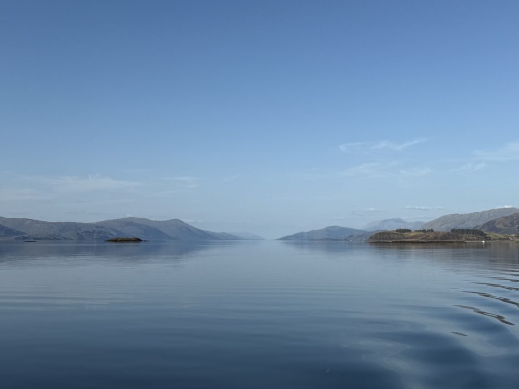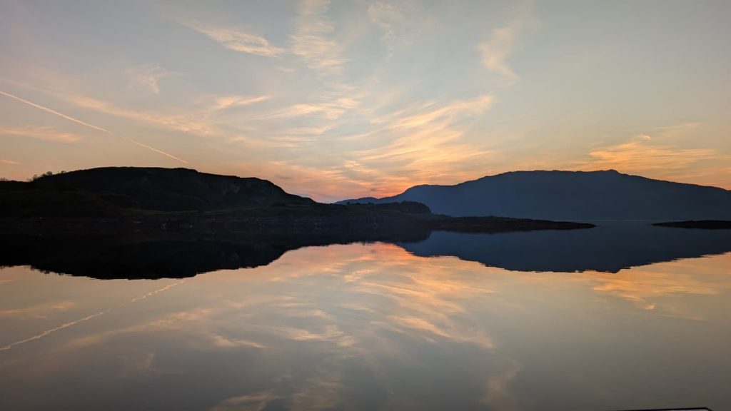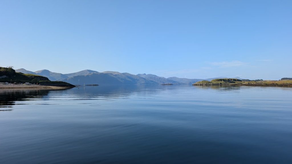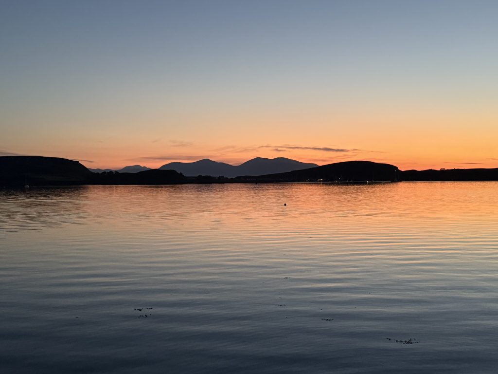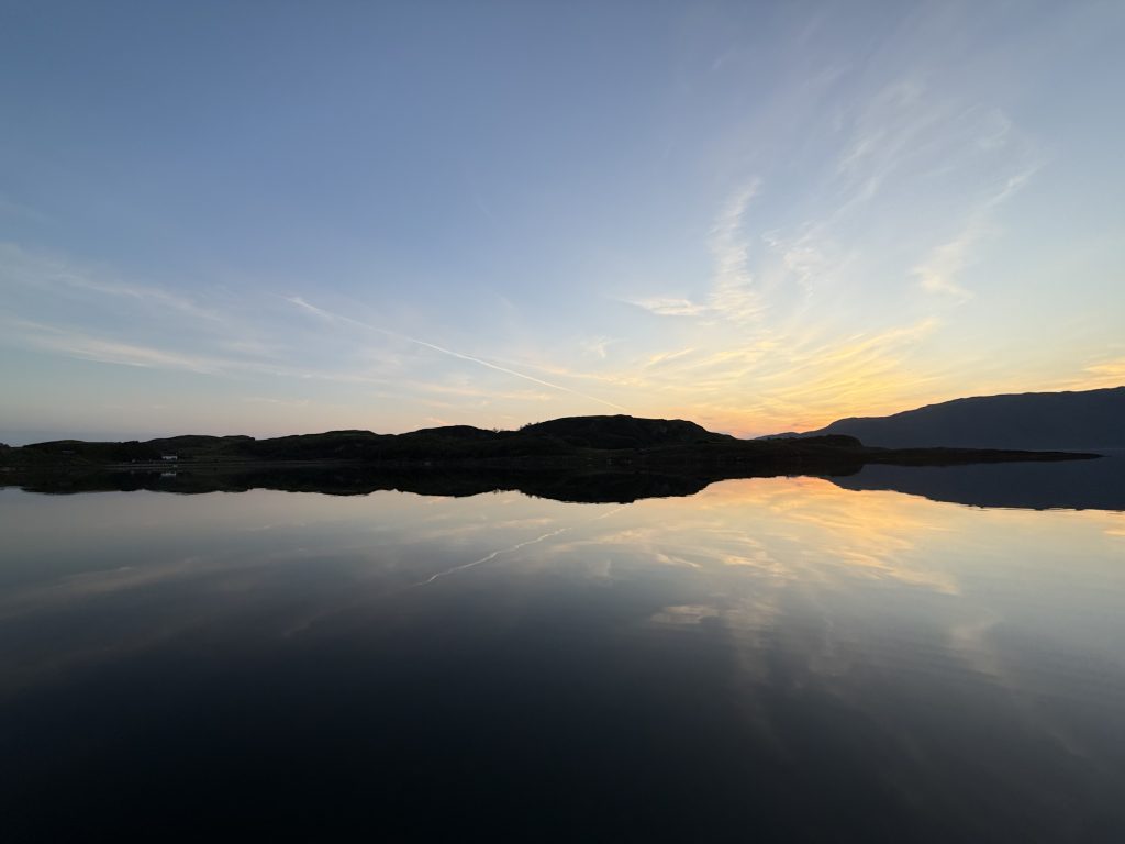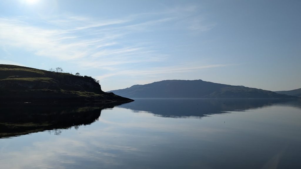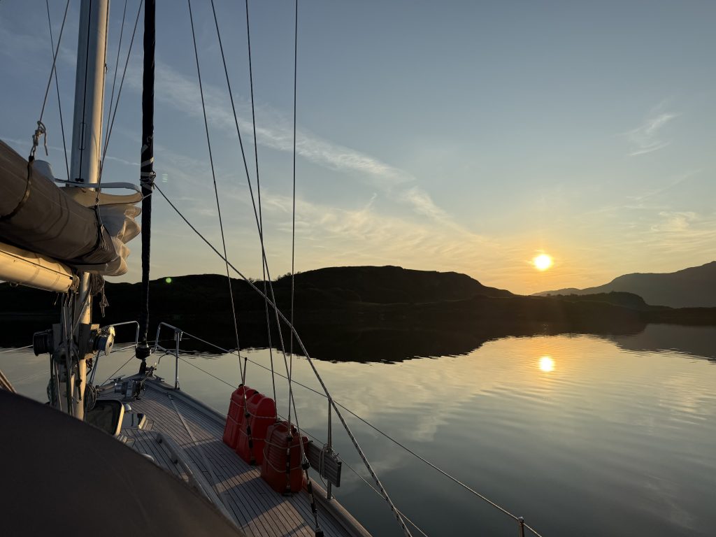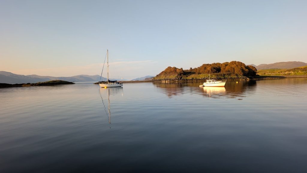 Gut gestärkt und bestens aufgelegt verließen wir Oban zum späten Nachmittag, um wieder einmal eine Ankerbucht anzusteuern. Die Sonne und Windstille hielt sich wacker, also motorten wir die paar Meilen nach Port Ramsay auf der Insel Lismore. Wir erreichten eine rundum geschützte Ankerbucht, in deren Eingang wir von ein paar Seehunden begrüßt wurden, die entspannt auf einem Felsen lagen. Und wieder teilten wir die Bucht nur mit zwei weiteren Booten. Das Wasser war so ruhig, dass es aussah, als würden wir auf einer Glasscheibe sitzen. Das in Verbindung mit der untergehenden Sonne und absoluter Stille, war einfach nur unglaublich schön. Als wir nachts einmal den Kopf rausstreckten, stellten wir fest, dass sich sogar der Sternenhimmel im Wasser spiegelte. Klar tut er das, aber wann sieht man das schon? Für uns war das jedenfalls eine weitere Premiere.