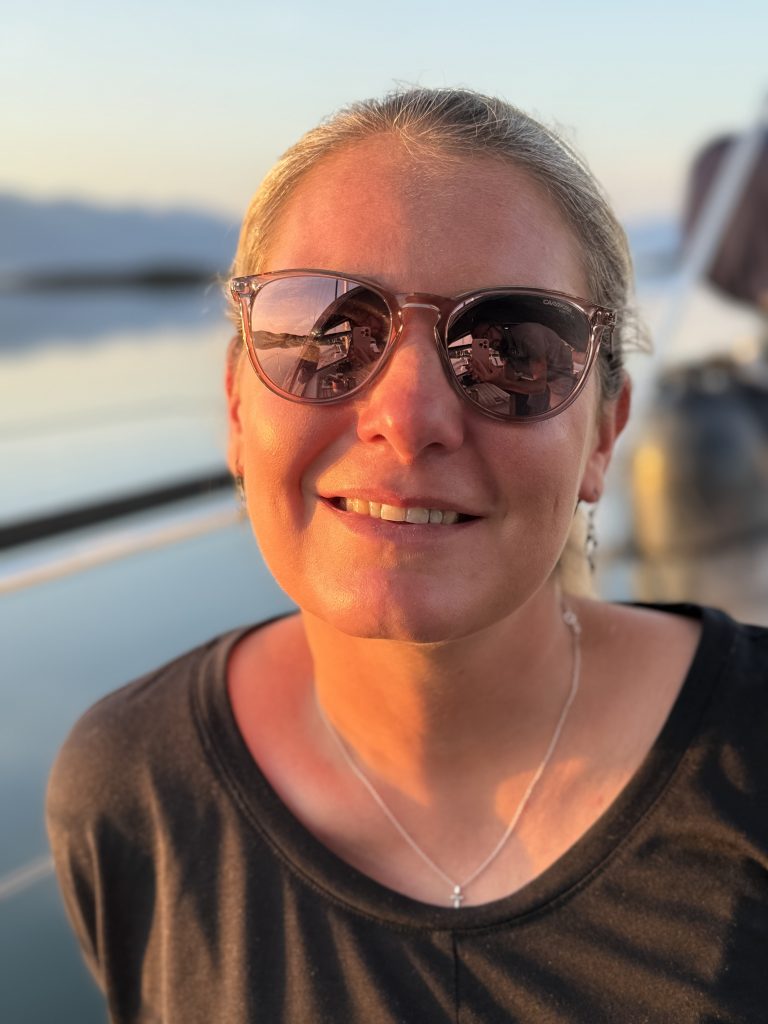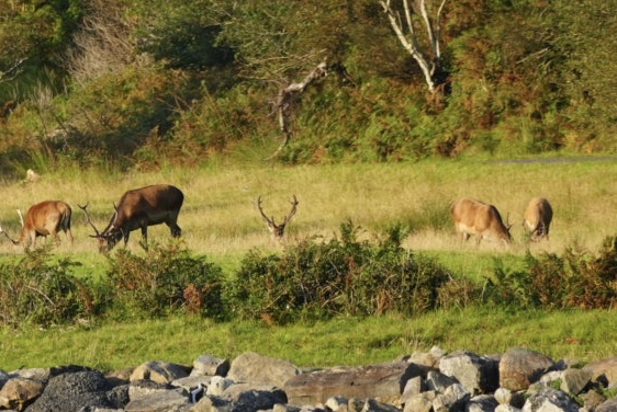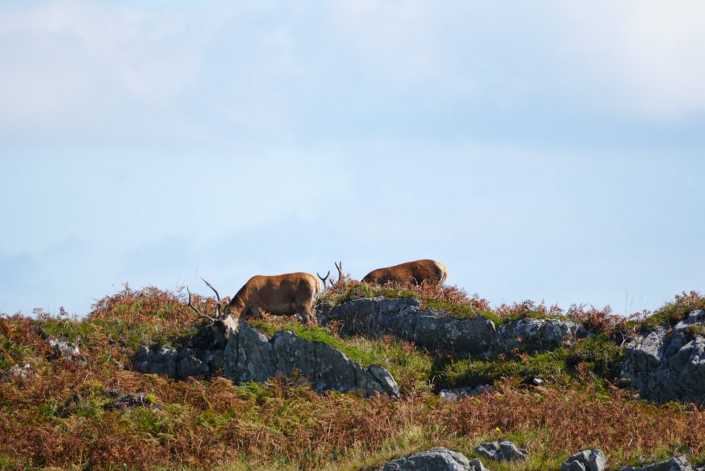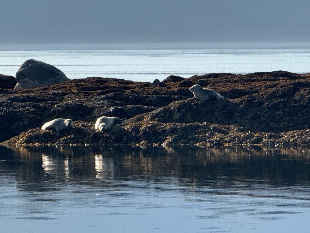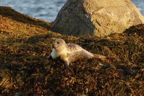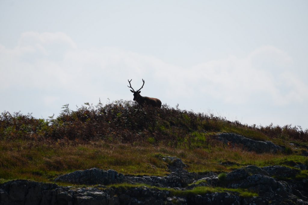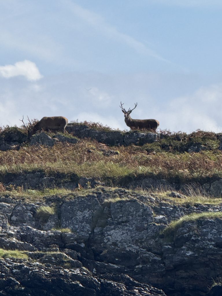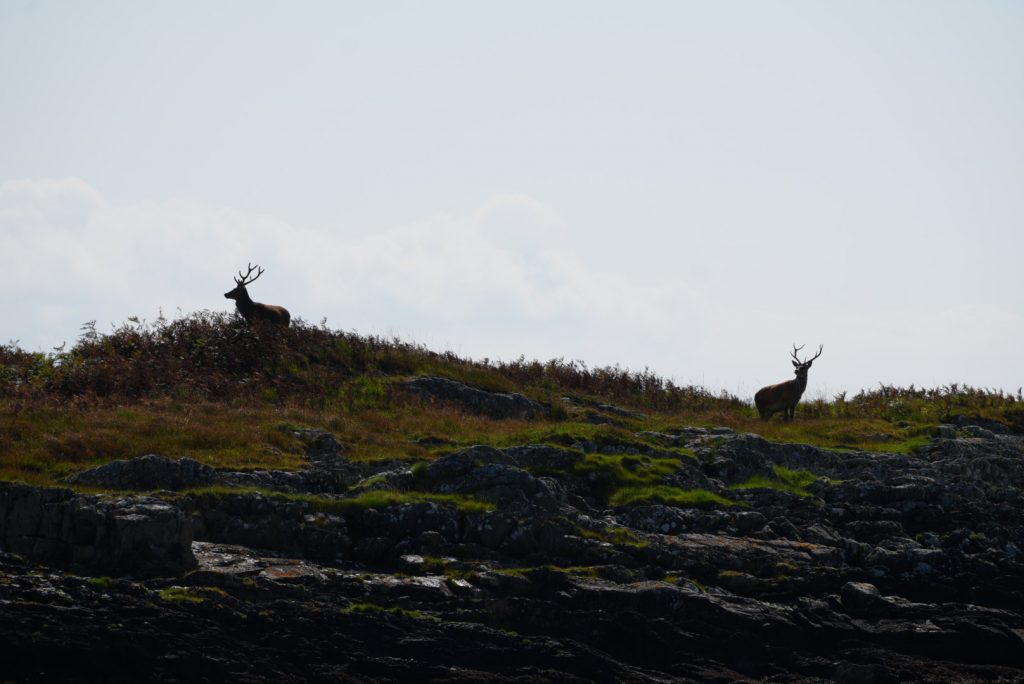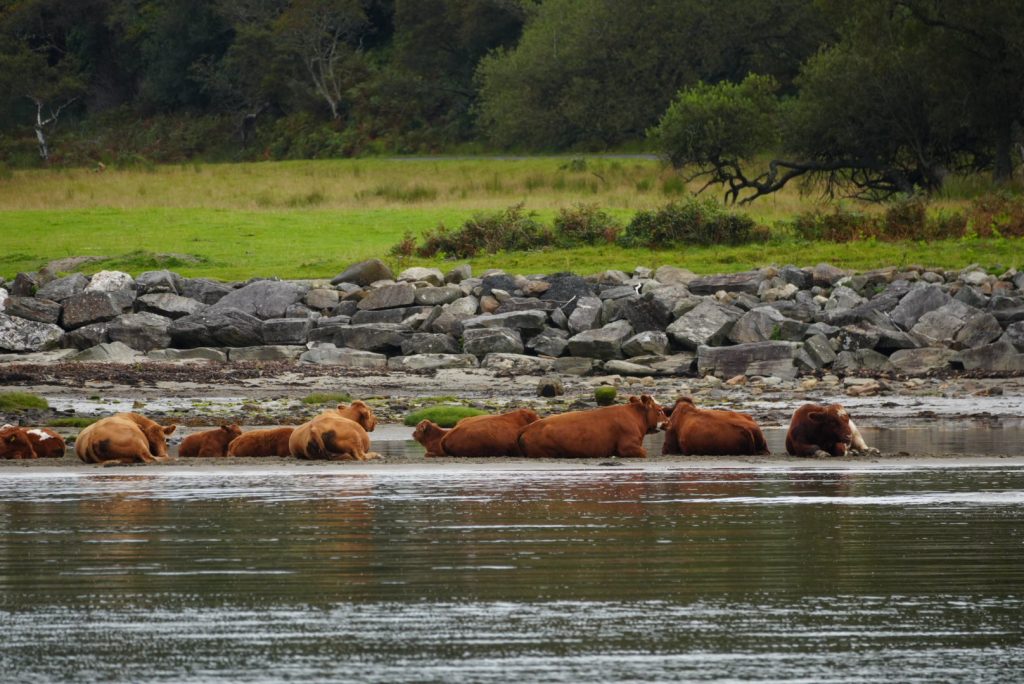 Dank dieser Landeffekte gesegnet mit viel Wind kamen wir gut voran und die Strömung half auch noch mit. Wir lagen am Abend mit nur zwei weiteren Booten in der Bucht, die umringt war von Felsen, Wiesen und einem kleinen Strand. Ständig guckte ein Seehundkopf aus dem Wasser, und auf der Wiese konnten wir tatsächlich wilde Hirsche beim Grasen beobachten. Das war mal eine Wildlife-Begegnung, die wir bisher noch nicht hatten! Wir lagen so ruhig, dass man fast vergessen konnte, dass wir uns vor Anker befinden und nicht in einer geschützten Marina. Beim morgendlichen Blick nach draußen staunten wir nicht schlecht, denn plötzlich saß eine Kuhherde am Strand und genoss die Abkühlung durch das auflaufende Wasser. Die Hirsche hatten sich nun auf die Felsen neben der Bucht verholt.