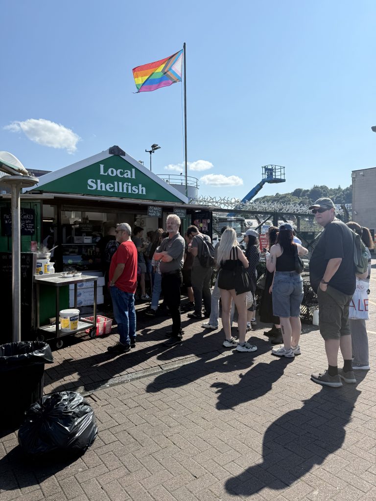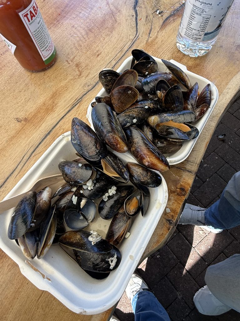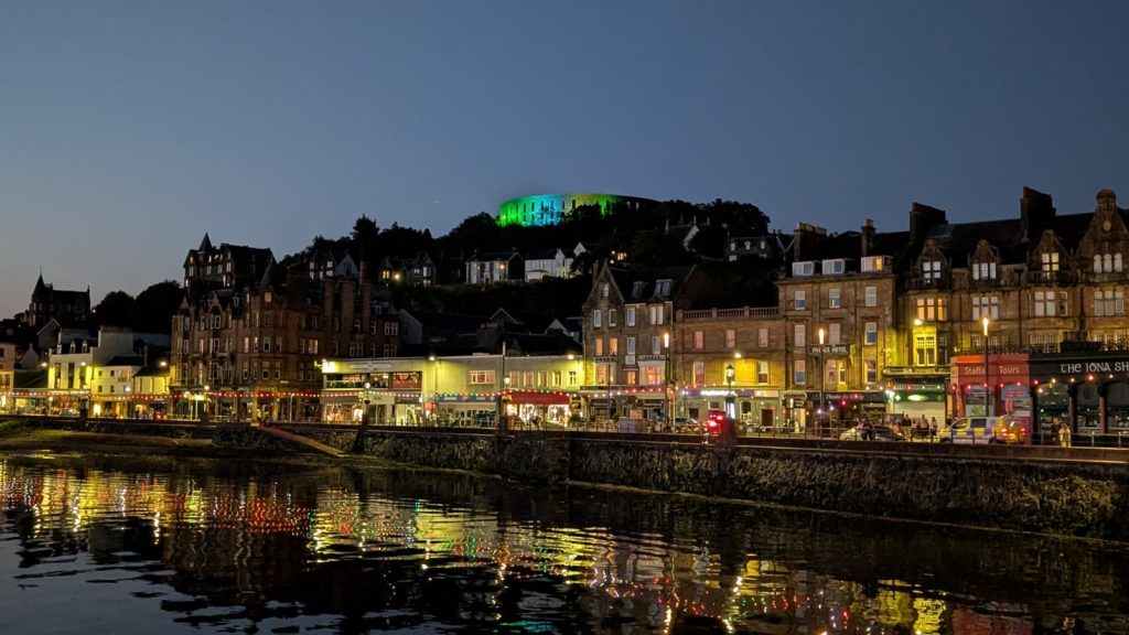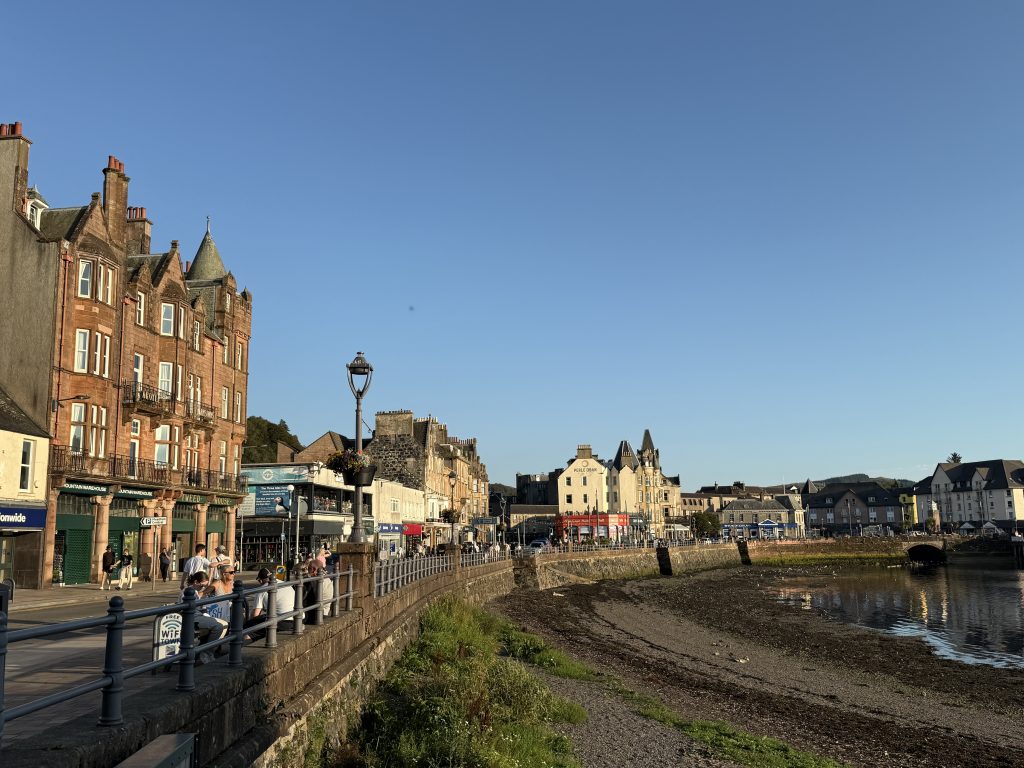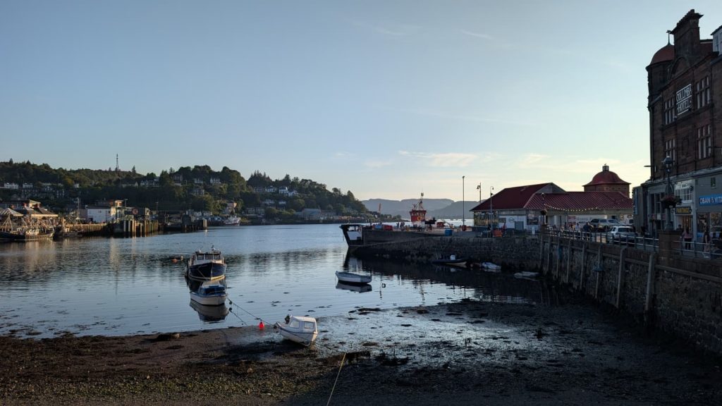 So hatten wir eine echt interessante Überfahrt und kamen am Abend in Oban an, einem malerischen und sehr touristischen Städtchen am schottischen Festland. Wir gönnten uns ein leckeres Abendessen in einem tollen indischen Restaurant, und verschoben die Stadterkundung auf Sonntag. Momentan stehen die Gezeiten nämlich so, dass wir sehr früh oder sehr spät starten müssen, und wir sind definitiv Team Langschläfer! So tingelten wir am Sonntag noch etwas durch den Ort und die Geschäfte, gönnten uns einen Drink in einem netten Café und organisierten uns einen Mittags-Snack bei einer Seafood-Bude. Und die war echt der Knaller! Von Austern über Fisch-Sandwiches und Miesmuscheln hin zu riesigen Seafood-Platten mit Hummer, Krebsen und Garnelen wurde so einiges geboten, und das zu wirklich günstigen Preisen. Entsprechend gut besucht war der Laden dann auch. Für mich gab es eine große Portion Miesmuscheln für gerade mal 6 Pound Sterling, dazu eine Auster (der feine Herr), und für Steffi einen schönen Garnelensalat. Lecker!
