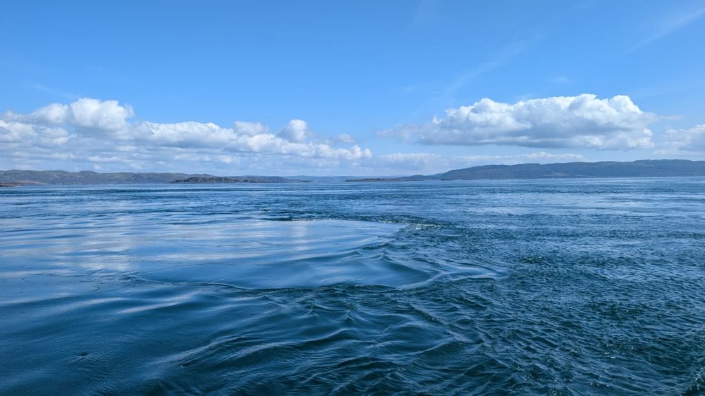 Und wir wollten noch nicht einmal durch die Engstelle durchfahren, sondern nur an ihr vorbei. Wir planten, die Passage so zu timen, dass wir in etwa zu Stillwasser da wären, um so nicht am Ende in die Engstelle reingesogen zu werden. Wir waren etwa eine Stunde zu früh dran, so hatten wir also noch Strömung, die aus dem Gulf of Corryvreckan herausströmte und abgefahrene Wirbel bildete, durch die wir uns durchquälen mussten. Unter Motor machten wir 6 Knoten durchs Wasser, über Grund fiel unsere Geschwindigkeit stellenweise auf bis zu 1,2 Knoten ab. Den Kurs zu halten war dabei eine echte Herausforderung. Dass es so wild werden würde, hatten wir allerdings nicht erwartet. Wir hatten fast Slack Tide, es gab keinerlei Wind oder Wellen, und die Springzeit war auch schon vorbei. Gute Planung ist hier wirklich essenziell, und eine Passage bei wilden Wind- und Seebedingungen während der halben Gezeit scheint so völlig undenkbar.