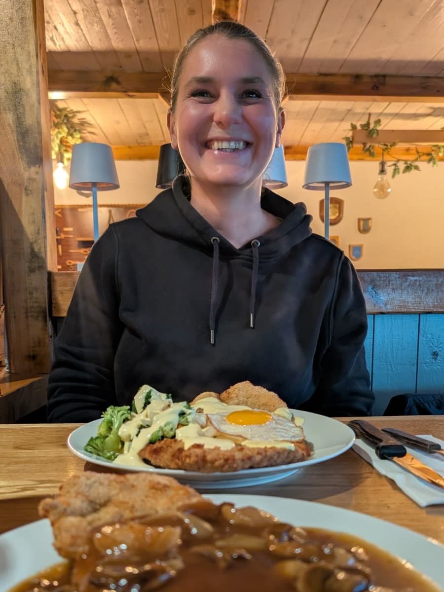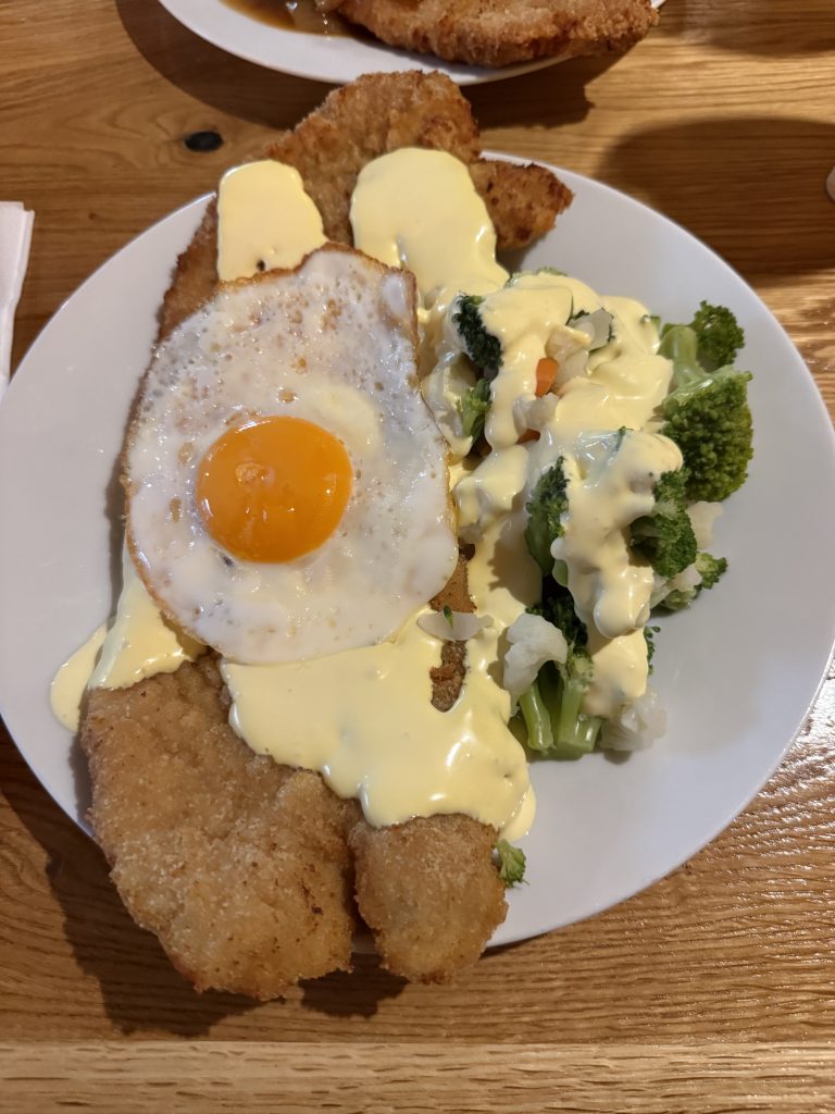 So, und, falls ihr immer dachtet, wir wären beide gute Esser, dann lagt ihr offensichtlich falsch. In dem kleinen, aber gemütlichen Restaurant stehen auf der Karte 3 Größen für die verschiedenen Schnitzel: Normal (900g), Klein (500g) und Kinderteller (250g). Die Gewichtsangabe bezieht sich dabei auf das Rohgewicht des Fleischs! Auf Anraten der freundlichen Bedienung entschied sich auch Christian für die „Kinderportion“ und wir gingen trotzdem mit sehr vollen Mägen und einer Box mit einem vollwertigen Mittagessen für Morgen nach Hause. Im Nachhinein erfuhren wir übrigens, dass es auch noch eine Seniorengröße mit 200g Schnitzel gibt. Warum Senioren offenbar noch weniger essen können als Kinder ist mir nicht ganz klar, aber die meisten Senioren die ich kenne hätten auch diese Portion mit den üppigen Beilagen niemals geschafft. Wie es möglich ist beinahe ein ganzes Kilo Fleisch in sich hineinzustopfen ist mir ein absolutes Rätsel, aber selbst die „kleine“ Portion sah schon brutal einschüchternd aus. Lecker war es allemal! Schön, wieder hier zu sein!