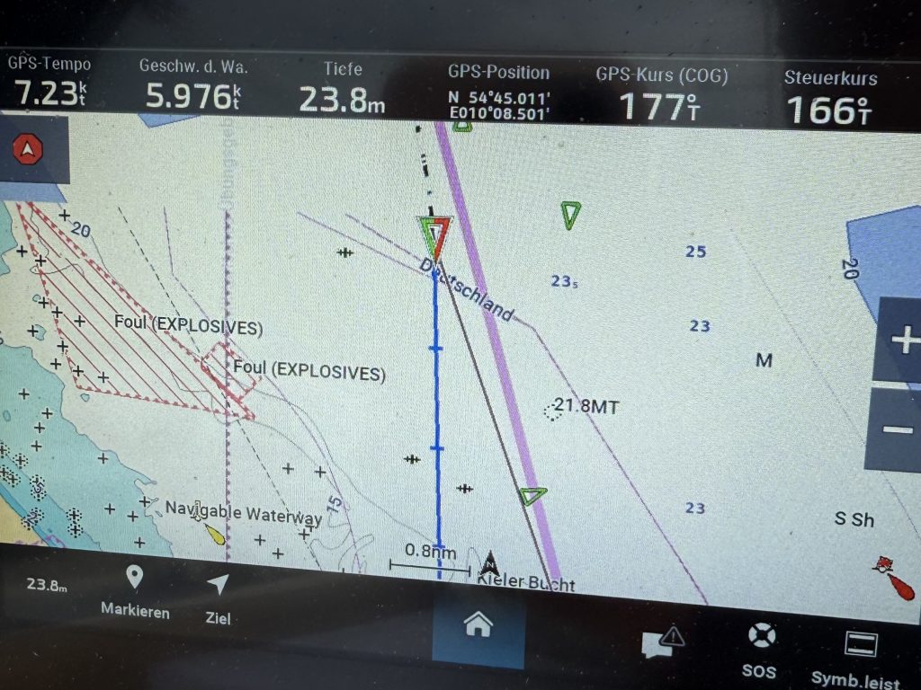 Nach einer Nacht in dem kleinen Hafen ging es heute früh auch direkt wieder weiter. Unser Ziel: Kiel-Holtenau in schlappen 60 Seemeilen Entfernung. Ein bisschen hatte der Wind nachgelassen, aber die Böen hatten sich auch heute noch nicht verzogen. Im 2. Reff und mit kleiner Genua flog die Krassy also Richtung Heimat als könnte sie es nicht erwarten. Halber Wind und kaum Welle sind die perfekten Bedingungen für unser kleines, schweres Bötchen und so ballerten wir mit einer unglaublichen Durchschnittsgeschwindigkeit von 6,9 Knoten über Grund über die Deutsche Grenze. Als der Plotter anzeigte, dass wir die imaginäre Linie, die Dänemark von Deutschland trennt, passiert hatten, feierten wir ein bisschen.